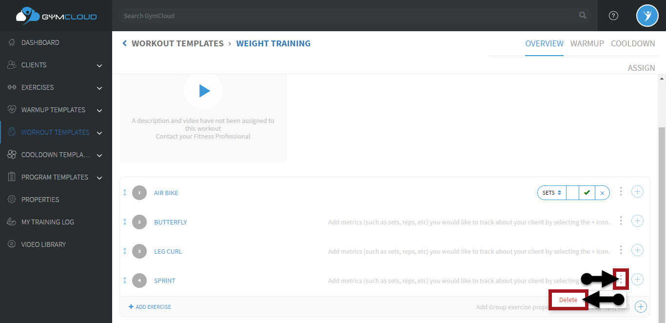 To delete an exercise, simply click the kabob icon to the right of the exercise and a dropdown menu will appear.