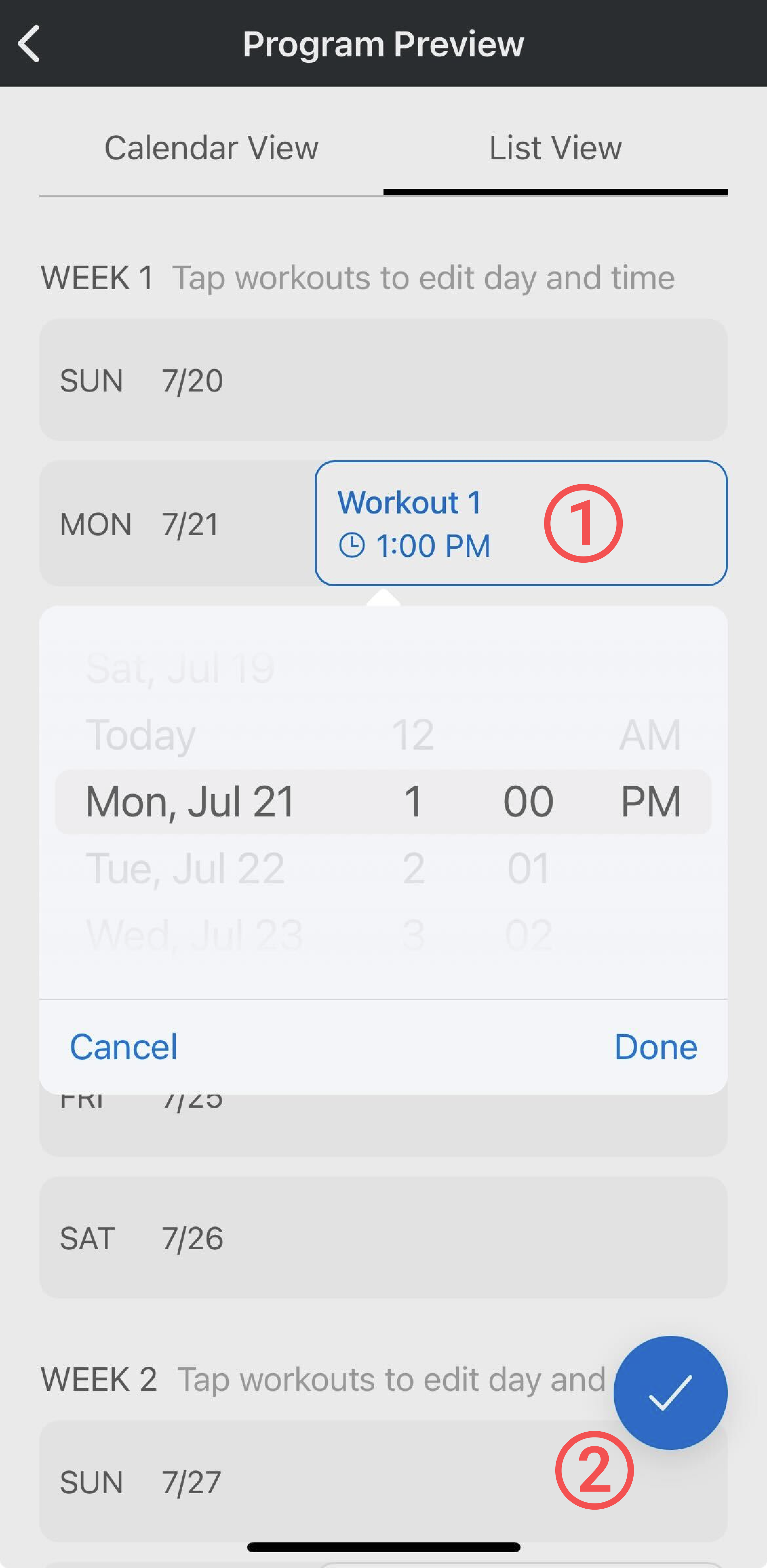 - In List View, tap a workout if you wish to change a workout's day or time.